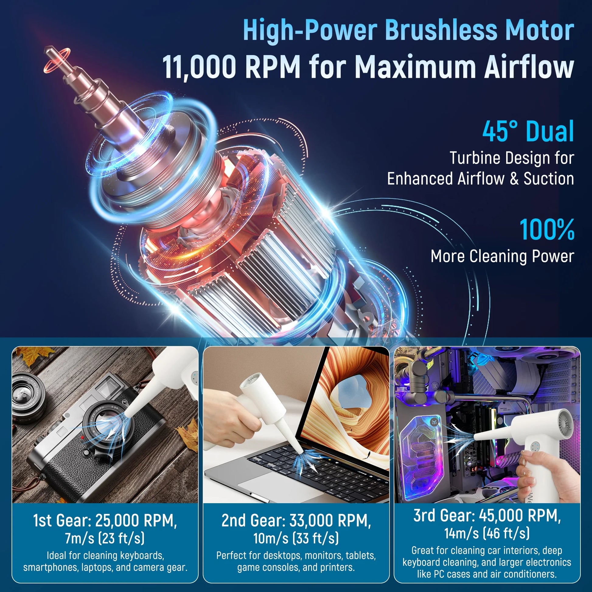 - With adjustable speed settings, this cordless compressed air duster offers a powerful airflow for thorough cleaning of various electronics, home appliances, car interiors, and office equipment.